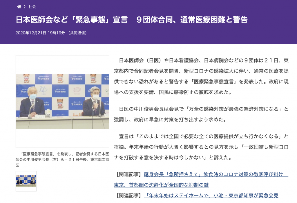 流石に東京新聞はトップページに尾身会長、中川医師会長、小池都知事の発表がならび強い危機感が表れていますが・・・