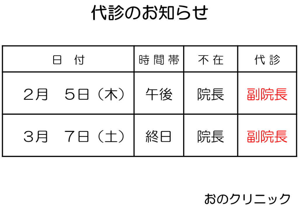 代診のお知らせ